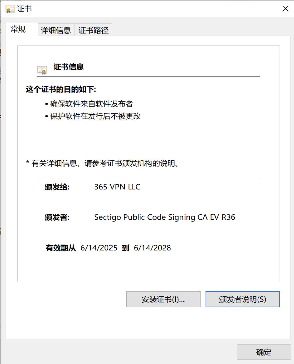 建议用户优先下载带有正规签名的软件版本,并核对发布者信息、证书状态和下载来源。对于 macOS、Windows、Android 和 iOS 平台来说,系统弹出的签名或开发者身份提示,本身就是第一层安全筛选。365VPN 软件自带正规签名,让用户更放心的使用。